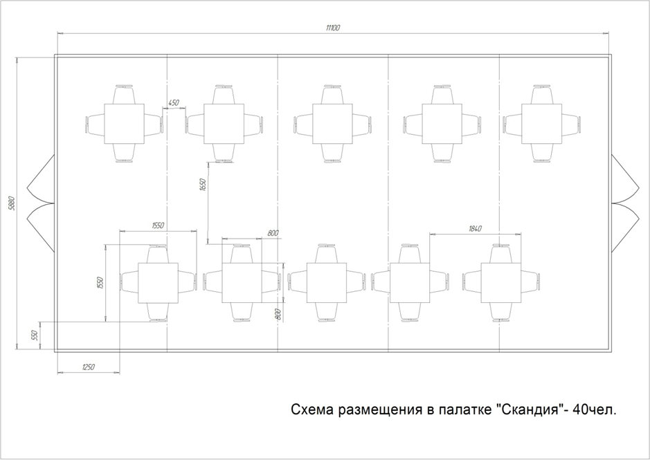 Палатка имеет 2 входа на торцевых стенах и по 5 больших окон-арок на каждой боковой стене, всего 10 окон.